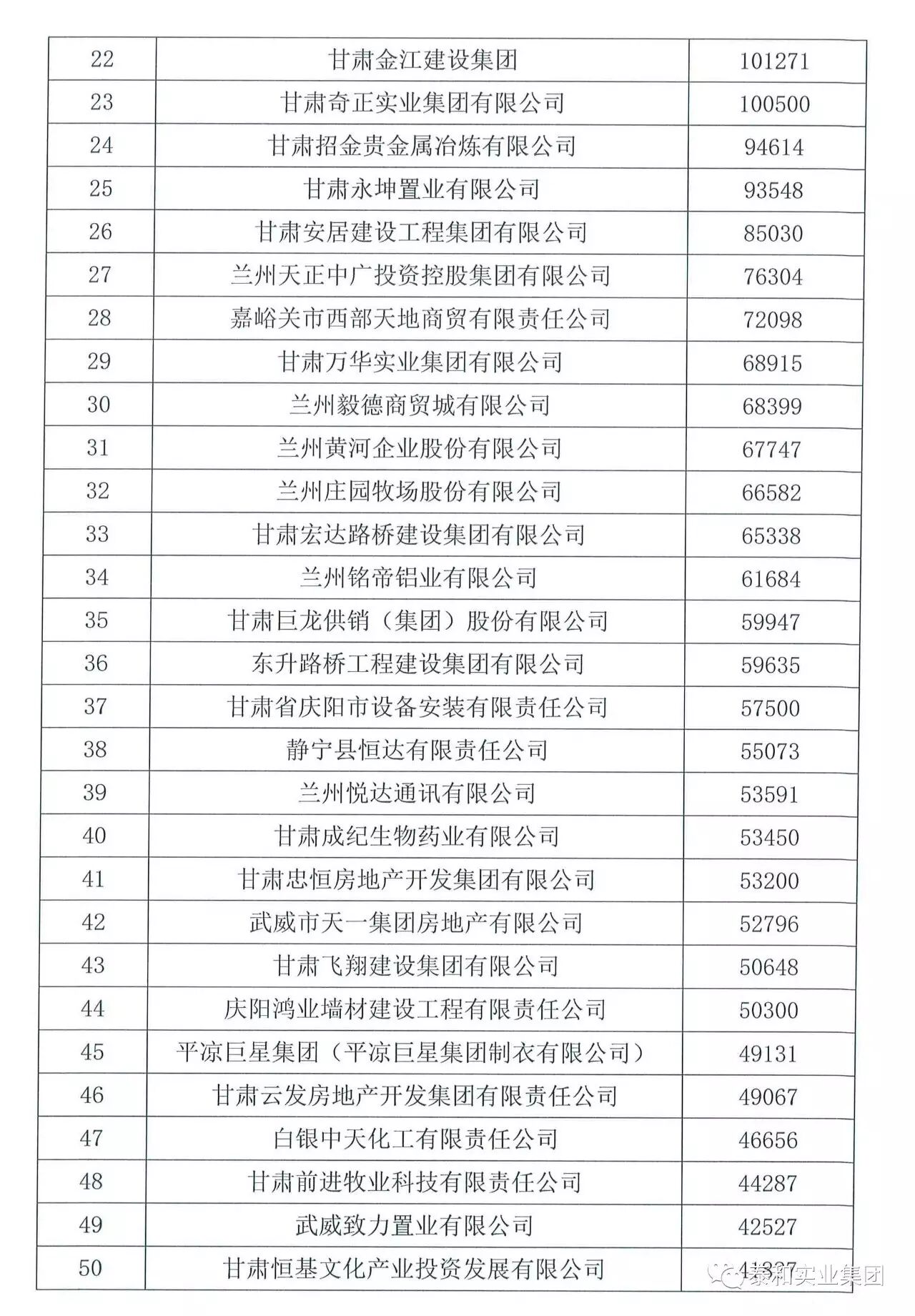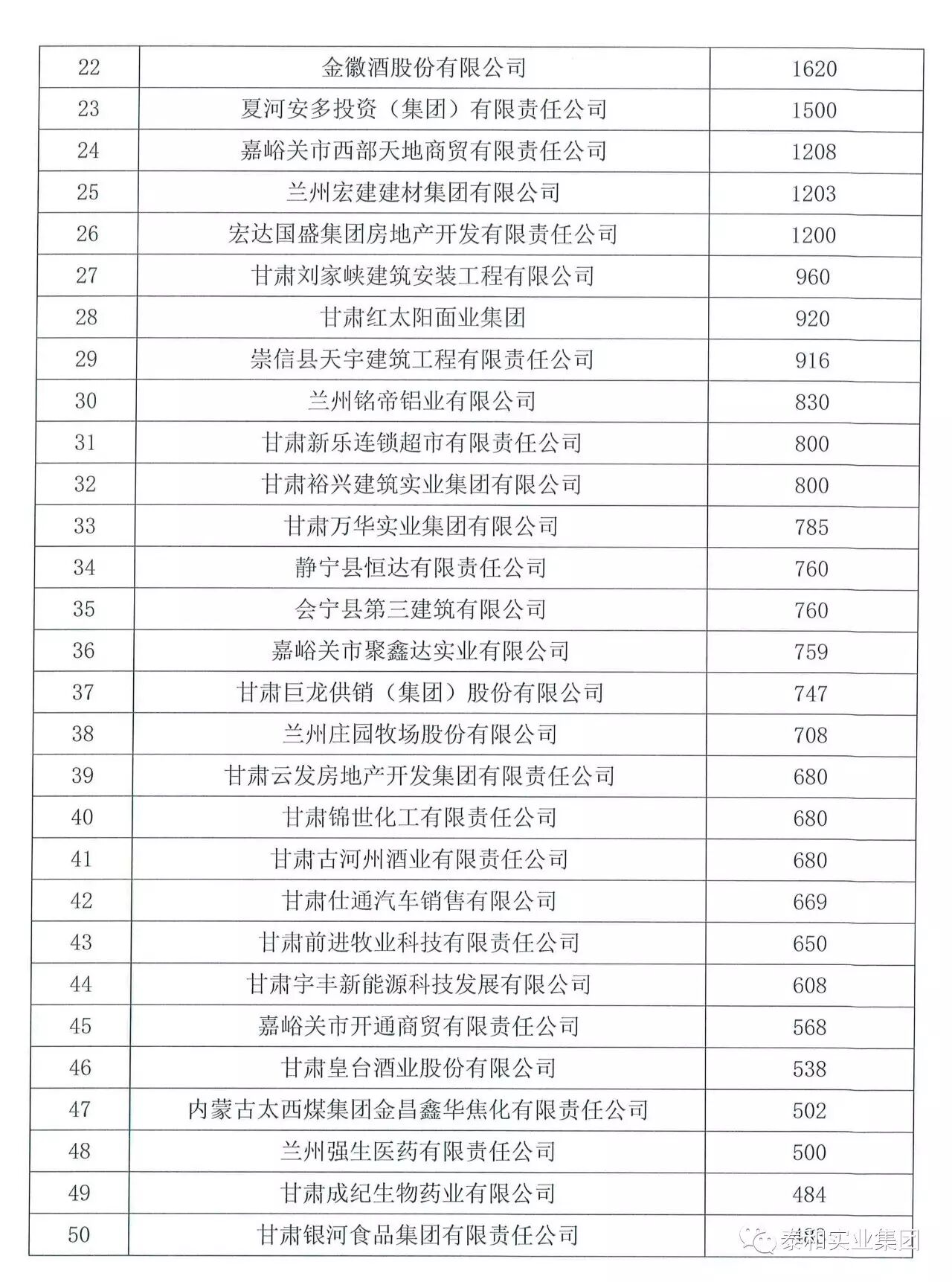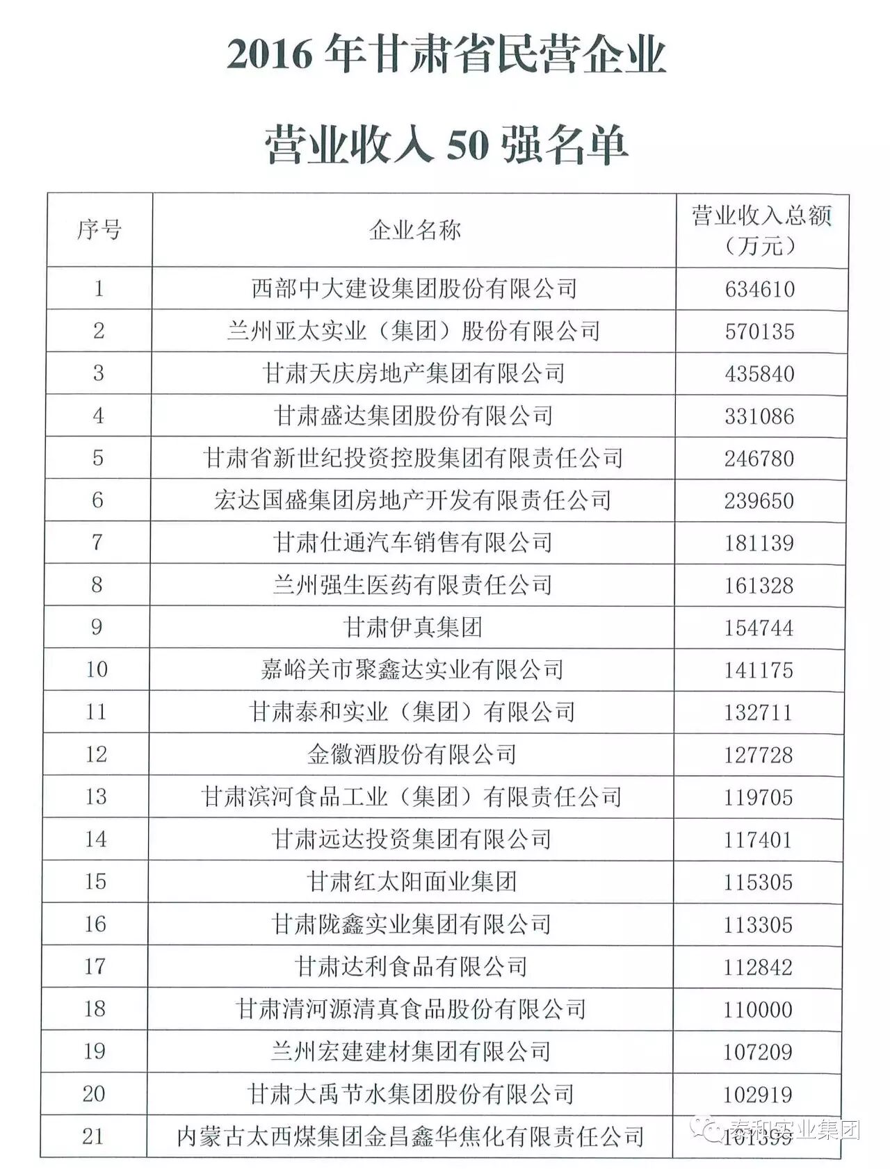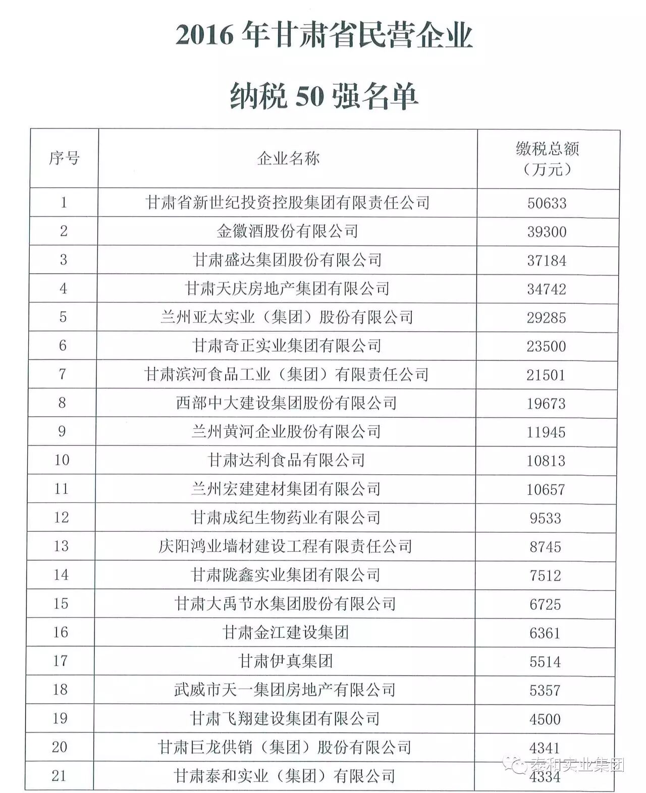 9月15日,在省工商联第十二届一次执委会议上,省工商联发布了甘肃省2016年度民营企业营业收入50强、纳税50强、安置就业50强“三个50强”榜单。根据榜单,甘肃泰和实业(集团)有限公司居2016年甘肃省民营企业营业收入50强第11位,纳税50强第21位。