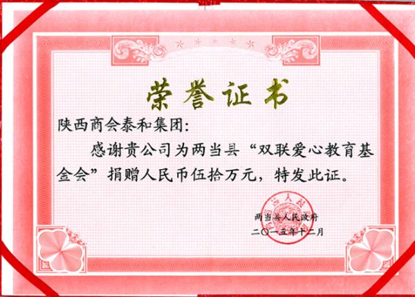 2015年12月,泰和集团向甘肃省两当县双联爱心教育基金会捐款50万元。